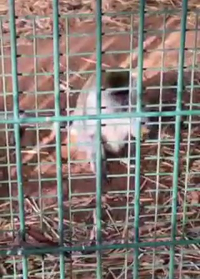 A medium shot depicts two quail in a green wire cage. The cage sits outdoors on a bed of straw and brown dirt. A voice speaks in the background in a language other than English.
