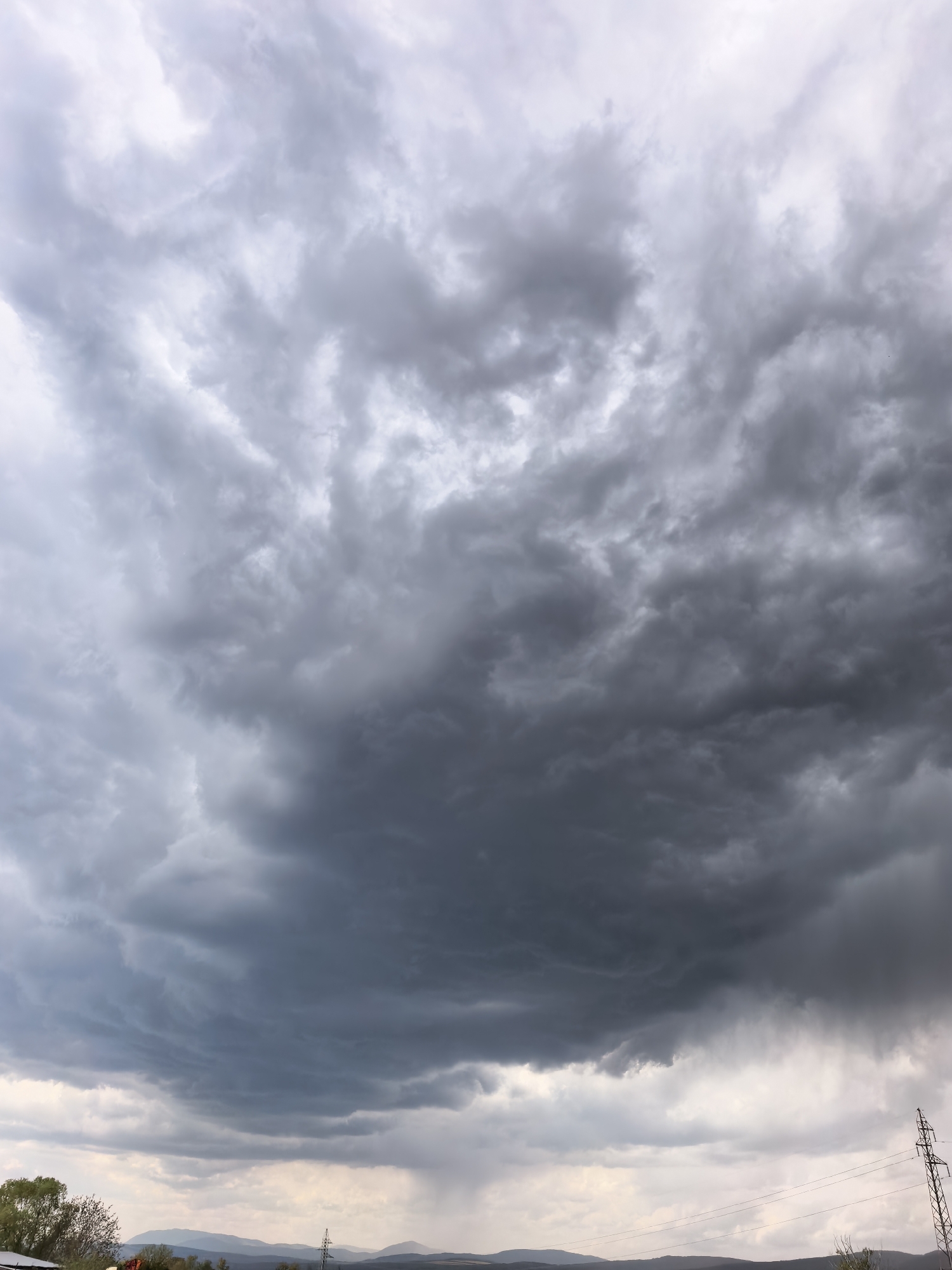 view of heavy, dark storm clouds gathering in the sky. Below the clouds, a landscape is visible. The background features rolling hills and mountains in the distance, obscured by hazy conditions. The foreground shows a few trees, roofs, and power lines. Based on the location of Sapareva Banya, Bulgaria, the landscape likely includes the Rila mountains. A rain shower is apparent, falling from a portion of the cloud cover.