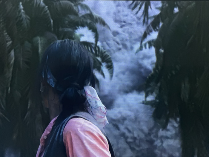 The image displays the upper back and right profile of an individual, positioned facing away from the viewer and looking towards the left. The person has dark hair styled in a low ponytail or bun, secured with a light-colored, possibly pink and white patterned scrunchie or fabric tie. A light blue or turquoise bandana or headscarf is visible wrapped around the head, partially obscured by the hair. The individual wears a light-colored, likely pink or peach, long-sleeved shirt, layered underneath a darker, possibly black or dark blue, sleeveless garment resembling a vest. A small, circular earring is visible on the right earlobe. The background consists of dense, dark green foliage, appearing to be large-leafed plants or palm trees, framing a lighter, blue-grey expanse. This background exhibits indistinct, voluminous forms consistent with dense cloud cover, mist, or disturbed water. The overall lighting of the scene is subdued. The specified location is the city of Apshak, Uzbekistan.