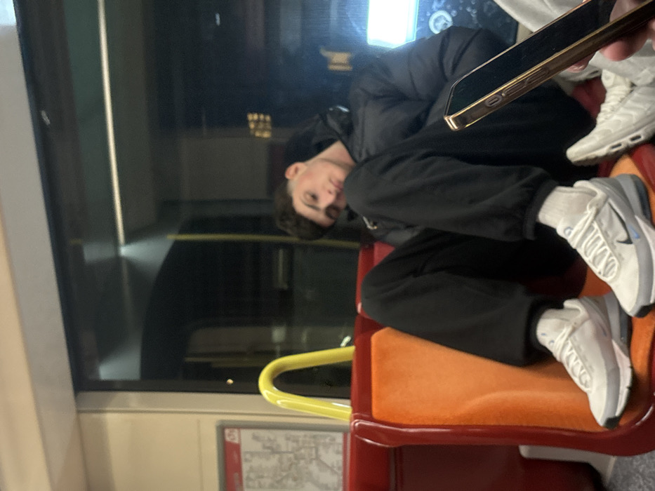 A young man wearing a black jacket and black sweatpants sits on an orange seat on public transportation. He's wearing white socks and grey and white sneakers. His feet are resting on the seat in front of him. He is looking directly at the camera. A window is behind him. In the upper right corner, a phone and the feet of another person wearing white sneakers are visible.