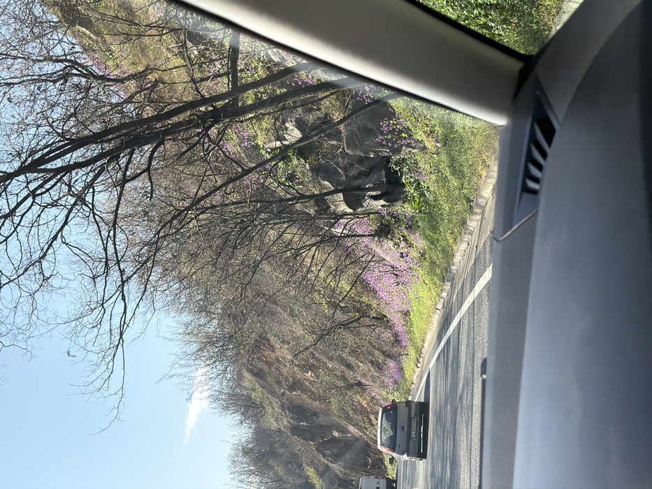 The image depicts a daytime scene from within a vehicle, looking forward on a multi-lane asphalt road in Stara Kresna, Bulgaria. The foreground shows the dark gray dashboard and a light gray A-pillar on the right. Ahead, a silver or light gray hatchback, likely a Vauxhall Corsa, travels in the rightmost lane, displaying a Bulgarian license plate "E 5900 KK." Further ahead and partially obscured, a white commercial van or truck is also in the same lane. To the right of the road, a steep, rocky hillside rises. This hillside is densely covered with bare-branched deciduous trees, indicative of early spring, alongside prominent exposed rock formations and large boulders. The lower slopes and ground immediately adjacent to the road are covered with vibrant green foliage interspersed with abundant clusters of small, purple-magenta flowers. The sky above is clear and bright blue with a few distant white clouds. Sunlight illuminates the scene from an elevated position, casting subtle shadows. No individuals are visible.