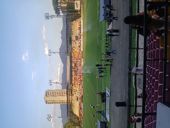 A stadium with people in the stands and on the sidelines. A soccer field is being watered. There's a tall building in the background with mountains and a blue sky. The view is from the stadium seats looking onto the field.