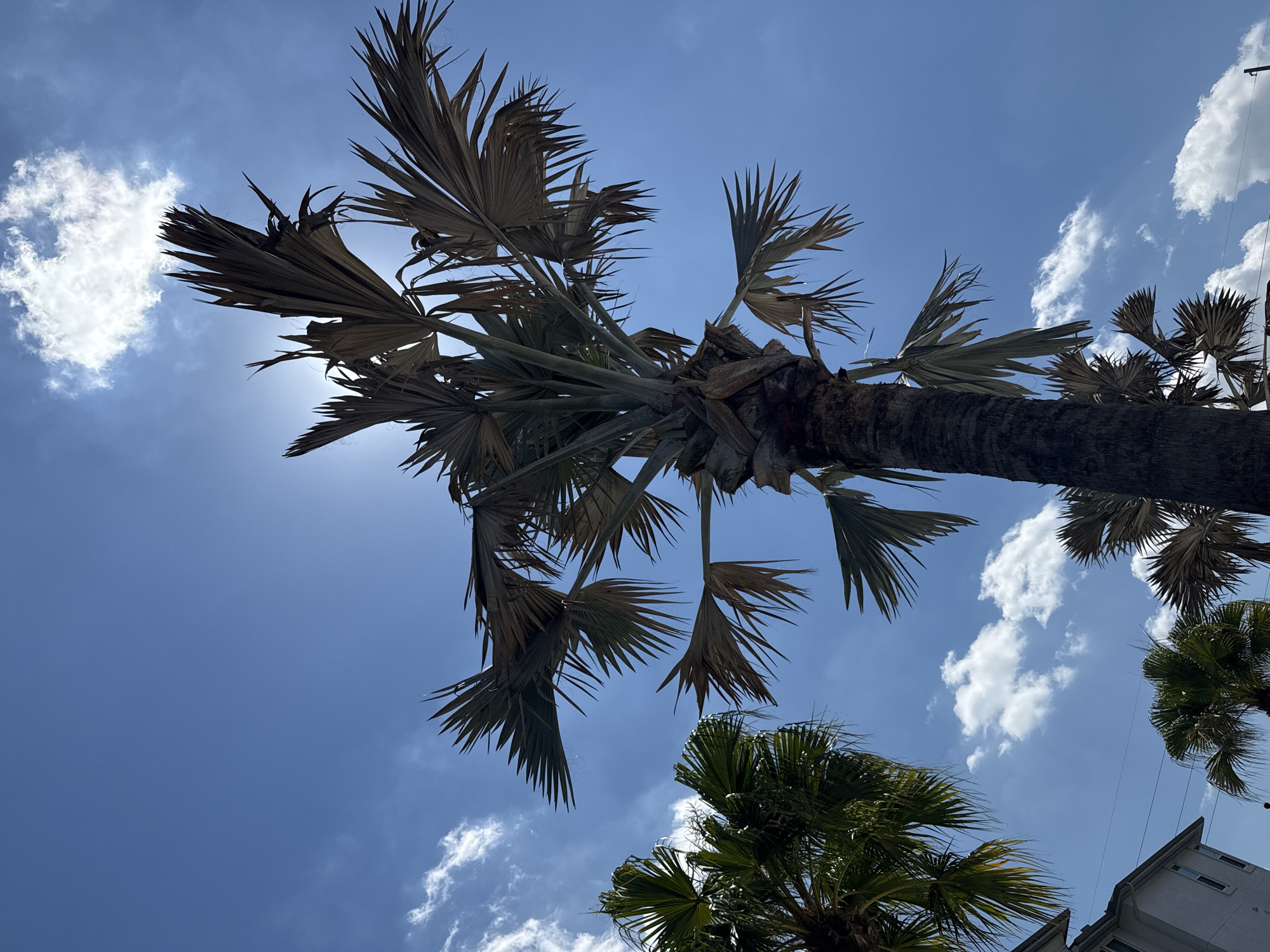 The image is a low-angle shot looking up at palm trees against a bright blue sky with scattered white clouds. The primary palm tree in the center of the frame has a thick, dark trunk and large, fan-shaped fronds that are mostly tan in color. The sun is positioned behind the fronds, creating a bright halo effect. A smaller, green palm tree is visible in the lower right corner of the frame. The corner of a light-colored building is visible on the right side of the image. The location is likely Orlando, Florida, based on the presence of palm trees, which are common in the region.