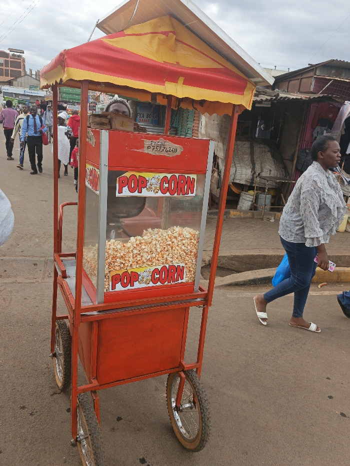 The scene unfolds on a street in Thika, Kenya, under an overcast sky, with general pedestrian activity. Centrally positioned is a red mobile popcorn vending cart, featuring a red and yellow striped canopy and a white solar panel affixed to its roof. The cart's main compartment is a glass-fronted display case filled with popped corn, marked with "POP CORN" decals. Above this, a metal popping pot is visible. A person with a light-colored head covering is partially visible behind the upper portion of the cart, observing the street. A white label displaying "Rochi" and the phone number "075134260" is taped to the cart's frame. The cart is equipped with four wheels, two larger at the rear and two smaller at the front. To the immediate right, a woman in a light, ruffled blouse, dark jeans, and white slide sandals walks towards the right side of the frame, carrying a blue bag and holding a small object. The background on the right features dilapidated, makeshift market stalls or structures with corrugated metal roofs and exposed building materials, some displaying items for sale. On the left, a paved pathway or street shows several pedestrians, including a man in a blue shirt and dark trousers, walking away from the viewer. A blue sign reading "FYA BORA DAIRY" is partially discernible behind the cart, and multi-story buildings are visible in the far distance on the left.