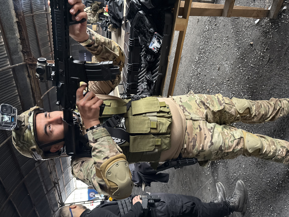 This scene is located in Svetovrachene, Bulgaria, within a large, semi-covered indoor facility featuring a corrugated metal roof structure. The floor is dark and littered with numerous small, white spherical pellets, consistent with airsoft BBs. In the foreground, a male individual is depicted in a three-quarter profile, facing right. He wears a multicam camouflage combat uniform, including a helmet with a mounted GoPro camera, a tan plate carrier/chest rig with multiple olive green pouches, tan elbow pads, and tan knee pads. A fixed-blade knife in a black sheath is secured to his right hip. He holds a black rifle, identified by "ING.BG" on its receiver, equipped with a red dot sight. His hands are positioned on the rifle, with his right hand near the trigger guard and his left hand supporting the foregrip. He is looking down the sights of the rifle, with his right eye squinted in concentration. A black wristband is visible on his left wrist, and a tattoo is present on his right hand. To the left and slightly behind the main subject, a second male figure is partially visible, wearing a black tactical shirt or vest, black tactical pants, and grey boots. A black pistol in a holster is visible on his right hip. He is standing and appears to be observing the scene. In the mid-ground to the right, a wooden pallet-style table holds several black hard cases, black tactical gloves, and a smartphone displaying an image or video. Further in the background, additional individuals in tactical gear are vaguely visible.