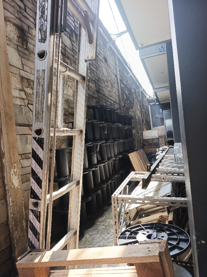 The scene depicts a narrow, sunlit outdoor passage located in Bandung City, Indonesia. To the left, a weathered wall composed of irregular, stacked stone blocks extends into the background. Against this wall, a large quantity of identical black cylindrical objects, resembling plastic pots, are neatly stacked in multiple rows and columns. In the foreground on the left, a worn extension ladder, likely aluminum, with black and white diagonal hazard stripes on its lower section and visible ropes, is propped upright. The ground is a light-colored, uneven concrete surface, scattered with various wooden planks and debris. On the right side of the passage, a dark structural column is prominent in the foreground. Beyond it, a multi-tiered, light-colored metal shelving unit contains a large black cable spool and other industrial materials. Further along the right, modern building elements with flat undersides and a glass-paneled entryway are visible, illuminated by harsh overhead sunlight filtering through a translucent or corrugated roof section. No individuals are present in the image.