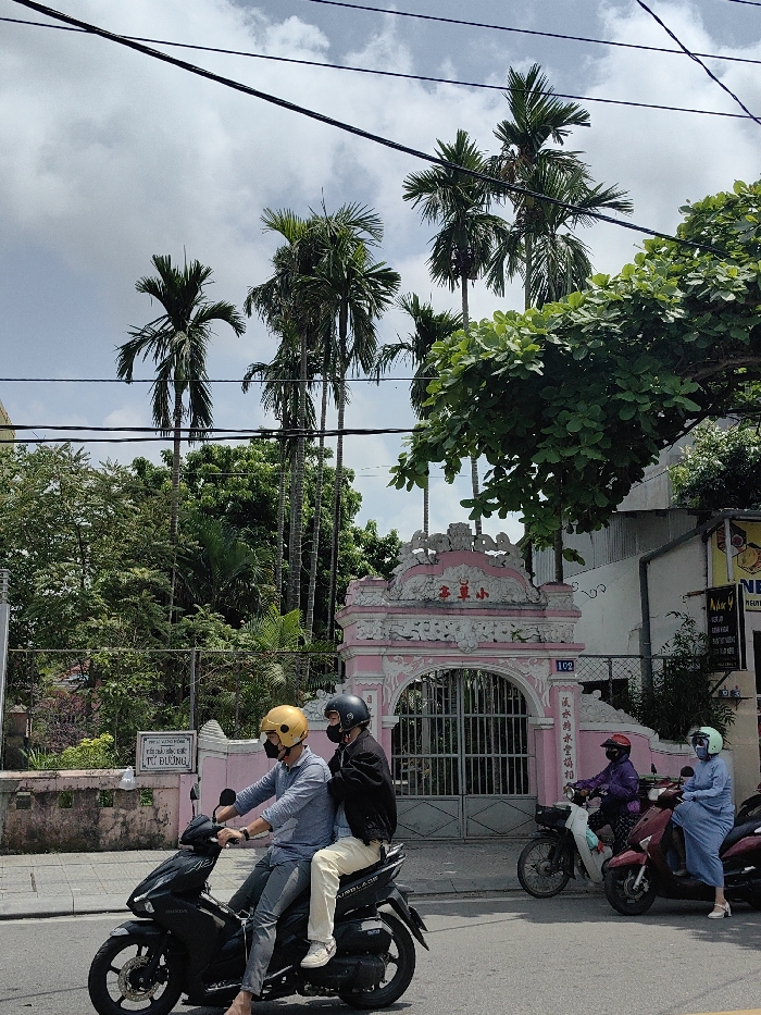 This image captures a daytime street scene at 102 Tỷ Dương Street, Vỹ Dạ Ward, Huế City, Vietnam, featuring the ornate pink gate of Tịnh Xá Ngọc Chơn (Ngoc Chon Monastery)