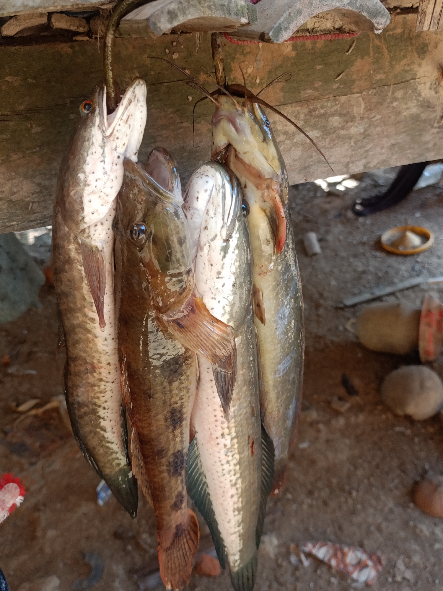 Five freshly caught fish are suspended from a rough wooden beam in Blangriek, Indonesia. The arrangement includes three fish identified as snakeheads (Channa species) and two fish identified as catfish (Clarias species) based on their morphology and prominent barbels on the latter. The leftmost snakehead is impaled through its upper jaw/head by a thin, dark, flexible rod or organic material which is then looped over the wooden beam, supporting its weight. The other fish appear to be strung together or individually secured. All fish display characteristics consistent with being recently deceased, with open mouths on several specimens. The wooden beam shows signs of weathering. Below the suspended fish, the ground surface is unpaved dirt or packed earth, featuring scattered debris including two halved coconut shells, a yellow circular dish containing a light-colored granular substance, and a dark piece of fabric or plastic, along with other unidentifiable detritus. The scene is illuminated by natural light, casting subtle shadows.