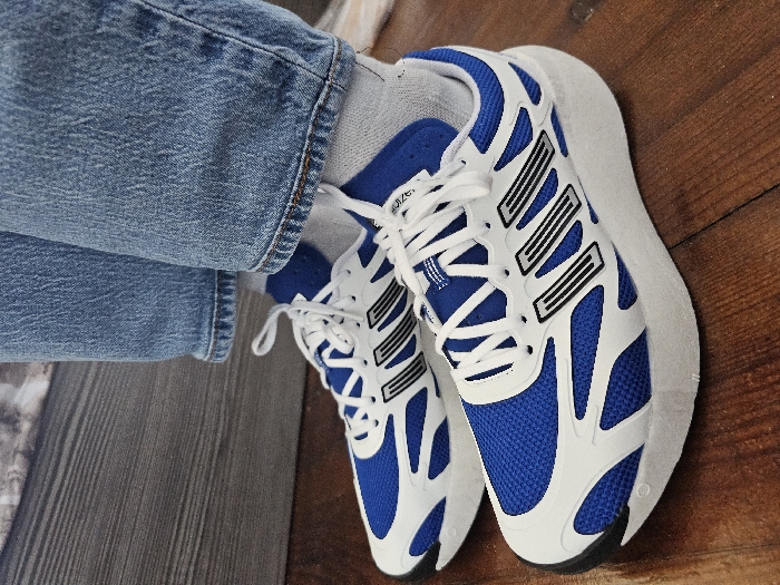 The scene, set in Kostinbrod, Bulgaria, features the lower legs and feet of an individual. The individual is wearing blue denim jeans, which are cuffed above the ankle, revealing white crew socks. They are shod in a pair of athletic-style sneakers. These shoes exhibit a primary royal blue mesh construction with intricate white synthetic overlays creating a skeletal or web-like pattern across the upper. Three silver-grey horizontal stripes with black outlines, consistent with Adidas branding, are visible on the lateral side of each shoe. White laces are present and tied. The shoes are designed with thick, contoured white midsoles, and a black accent is visible on the toe cap of the left shoe. The subject stands on a surface composed of distinct brown wooden planks. The background is blurred, showing a textured surface with horizontal dark grey lines, suggestive of a wall.
