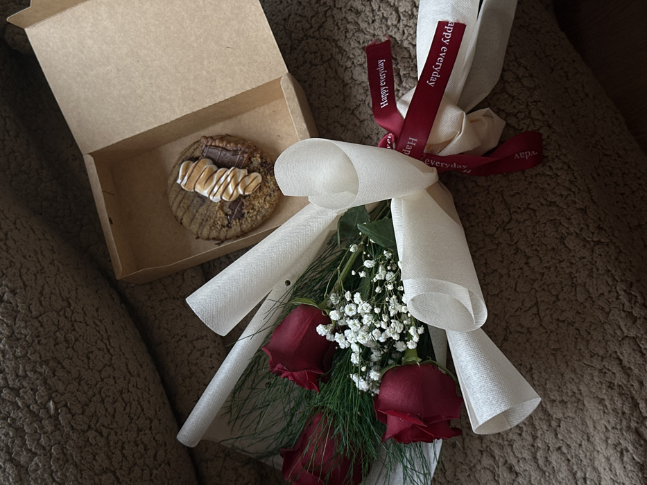 - "The image displays a close-up, elevated view of a gift presentation consisting of a flower bouquet and a single gourmet cookie in an open box, arranged on a textured brown surface" by FM-aXNlA3, licensed under CC BY 4.0