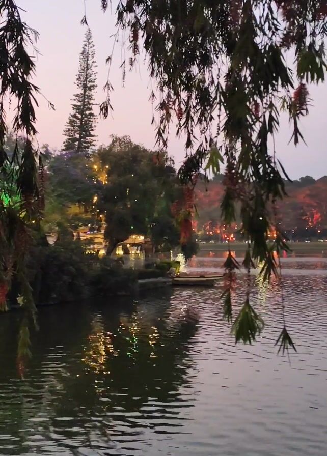 tranquil view of a lake at twilight, framed by the overhanging branches of a tree. The water reflects the soft glow of lights scattered along the lake's edge and on an islet in the distance, creating a shimmering effect. The sky is a pastel blend of pink and purple, indicating either sunset or sunrise. The islet features lush greenery and architectural structures adorned with lights. The overall scene conveys a sense of peace and serenity.