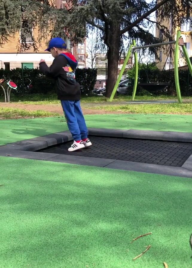 boy in a playground. The boy is wearing a blue baseball cap, a black jacket with a colorful design on the back, blue pants, and white sneakers with red stripes. He is standing on a square trampoline set into a green, artificial turf surface. The boy jumps once on the trampoline and then walks off of it. Behind the boy and trampoline are trees, a green and silver swing set, a dark green hedge, and some buildings in the background. The sun appears to be shining on the playground.