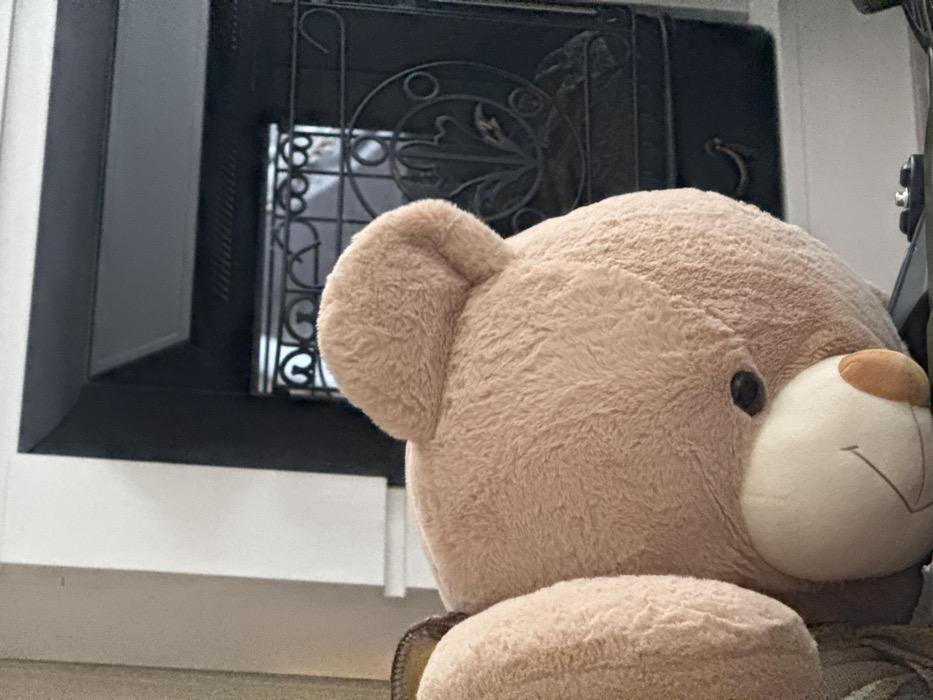The image depicts a large, light brown plush teddy bear positioned in the foreground, largely obscuring the lower-right portion of the frame. The bear's head and part of its left arm are visible. It features a dark, bead-like left eye, a light-colored snout with a stitched smile, and a small, tan nose. In the background, to the right of the bear, a dark, recessed fireplace opening is visible. Within this opening, an ornate black metal grate, featuring scrollwork and a stylized leaf motif, is present. A white vertical structure borders the fireplace to the left, indicating a mantel or wall partition. The scene is located in a residential or indoor setting in Makiivka, Ukraine.
