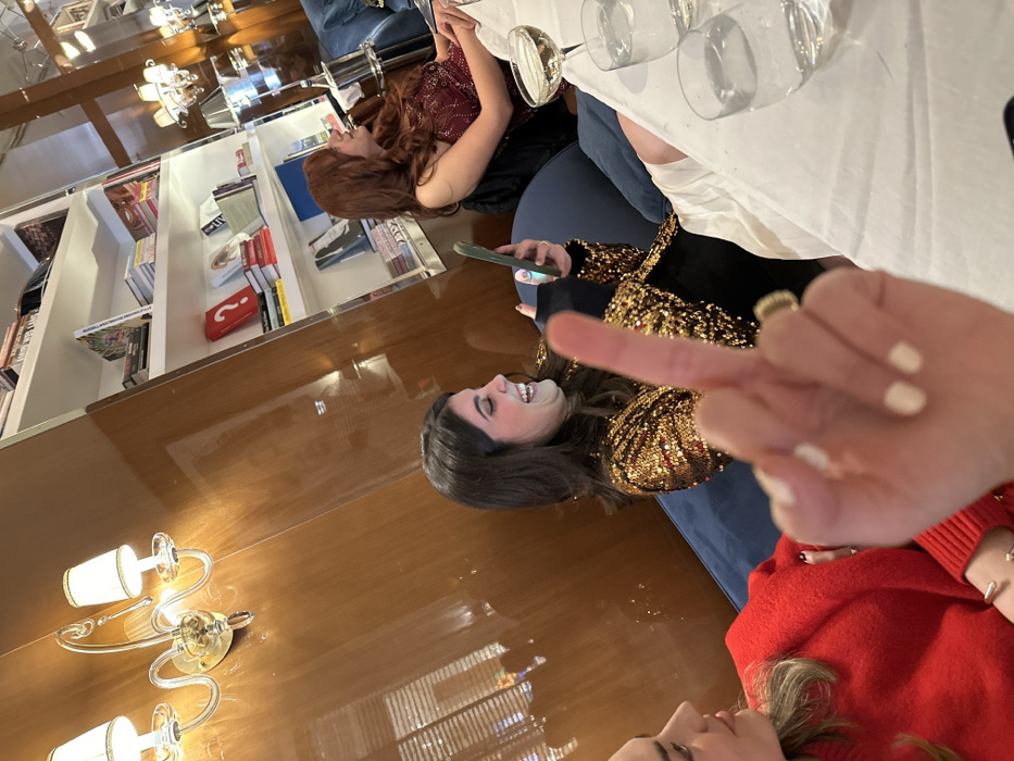 Three women are seated at a table. One woman in a gold sequin jacket smiles at a phone screen. Another woman, wearing a red top, glances upwards. A third woman with red hair reclines in the background. A hand gives the middle finger to the camera, with a gold ring visible on the ring finger. Wine glasses are scattered on the table. A bookshelf and wall sconces add to the indoor scene.