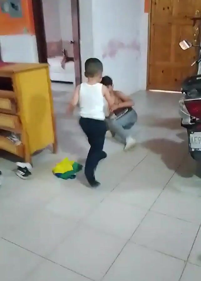 A child in a white tank top and dark pants runs across a room with tiled floors and collides with a person. The child and the person end up wrestling on the floor. The room contains a yellow cabinet, a scooter, and a doorway with a bed visible in the adjacent room. A yellow, blue, and green toy lies on the floor.