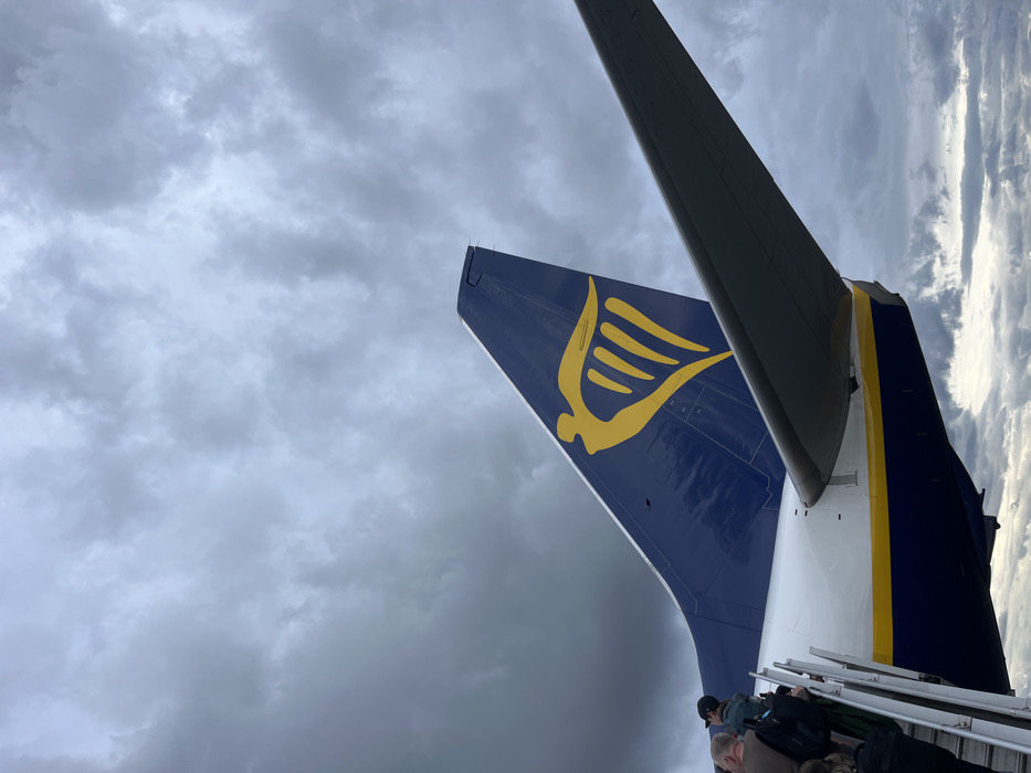 - "tail of a Ryanair airplane with its iconic yellow harp logo against a cloudy sky" by FM-kkr2I2, licensed under CC BY 4.0