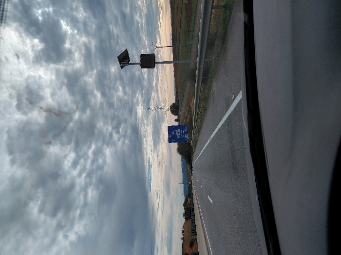 A gray highway stretches into the distance under a cloudy sky, captured from a vehicle's perspective. The road features a white line marking lanes, with fields and vegetation bordering the roadside. Overhead signs and structures are visible, including a blue road sign. A glimpse of the vehicle's interior is seen on the right.