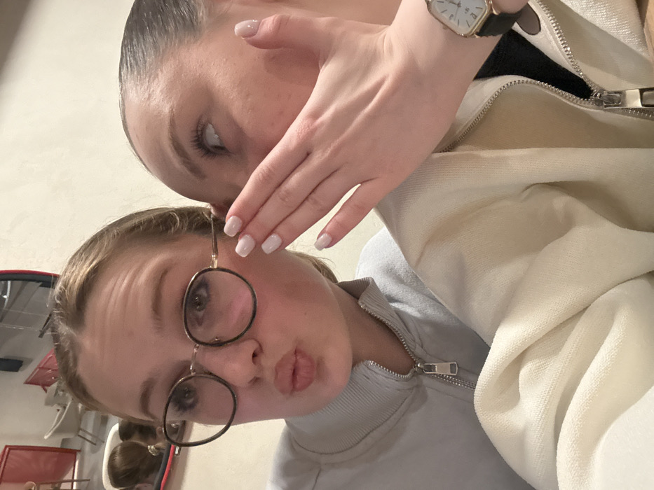 The image displays two young adult females captured in a close-up, indoor setting within the city of Kragujevac, Serbia. The female on the left has light hair, wears round eyeglasses with dark rims and gold-toned temples, and has her lips pursed, facing the camera. She is clad in a light blue or grey zipped collared top. The female on the right is partially visible, with her right hand covering her mouth, fingers extended upwards. Her fingernails are manicured with a light, opaque polish. Her head is turned slightly, with her right eye looking upwards and to the left. She wears a cream or light beige zipped garment and a square-faced watch with a dark strap on her left wrist. The background is out of focus, revealing blurred reflections in a mirror and indistinct hints of indoor furniture, suggesting a cafe or lounge environment. No specific Kragujevac landmarks are visible.