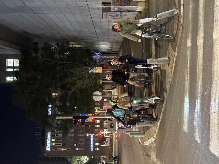 A nighttime street scene features several people riding bicycles and scooters along a sidewalk. One individual is on a bicycle with a light-colored jacket. Below, there are three others on scooters, wearing helmets, and another on a bicycle. Buildings are visible in the background, including one with the name "Abraham" and "Locker Room" vertically printed on it. Street signs and lights are also visible, contributing to the urban atmosphere.