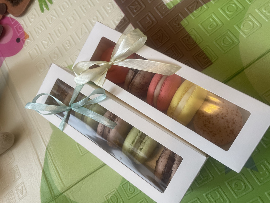 - "The image displays two white rectangular gift boxes containing macarons, situated on a textured playmat in Tolyatti, Russia" by FM-6N9303, licensed under CC BY 4.0