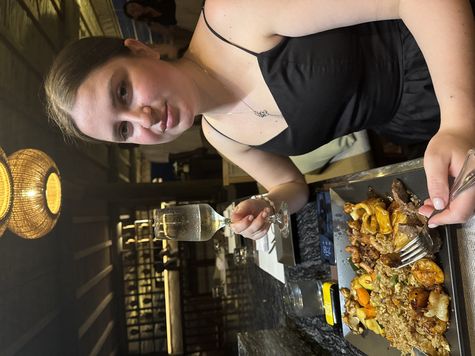 A young woman with dark hair and a black spaghetti-strap dress is seated at a table in a dimly lit restaurant. She is holding a glass of a clear beverage and using a fork to eat from a large plate of food. The plate contains various items, including fried rice, shrimp, vegetables, and beef. A woven light fixture is visible in the background.