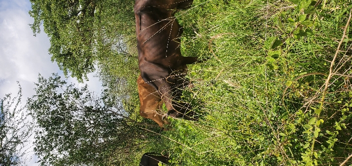 The scene depicts a rural, vegetated area in Kitonyoni, Kenya, under a partially cloudy daytime sky. Three bovines are visible among dense green foliage. In the mid-foreground, a dark brown cow faces left with its head down, grazing on the tall grass and plants. This animal exhibits visible rib definition and a linear mark or scar on its left flank. Behind it, slightly to the left, a lighter brown cow also grazes with its head down. A third, dark bovine is partially visible on the far left edge of the frame. The immediate foreground consists of thick green grass, broad-leafed plants, and visible thorny branches. Deciduous trees with green leaves form a dense backdrop, obscuring any further horizon. No human subjects or man-made structures are discernible.