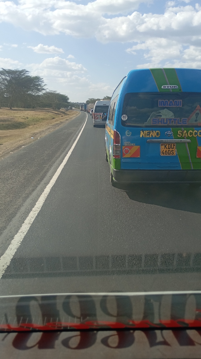 A line of vehicles, mostly minibuses, is stopped on a two-lane road. The minibus closest is blue and green with the words "IMANI SHUTTLE" and "NENO SACCO" printed on the back. The number plate reads "KDL 460S". The road is surrounded by dry vegetation and scattered trees. The sky is bright with scattered clouds, and the image is taken from inside another vehicle, with part of the dashboard visible at the bottom.