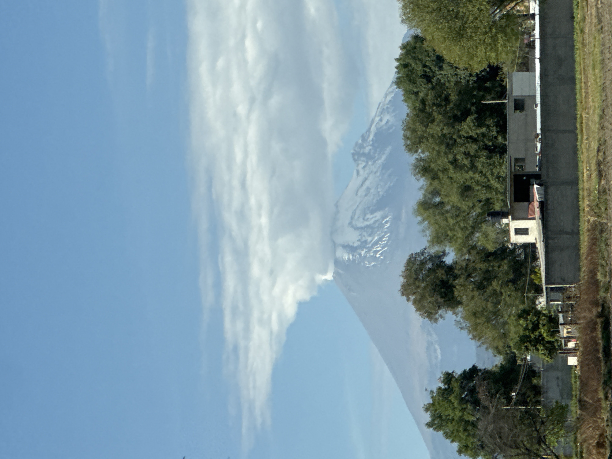 A landscape in San Rafael Tlanalapan, Mexico, shows a snow-capped volcano rising into a blue sky with scattered white clouds. The right side of the image reveals green trees and a two-story grey building adjacent to a field with dry vegetation. No people are visible.