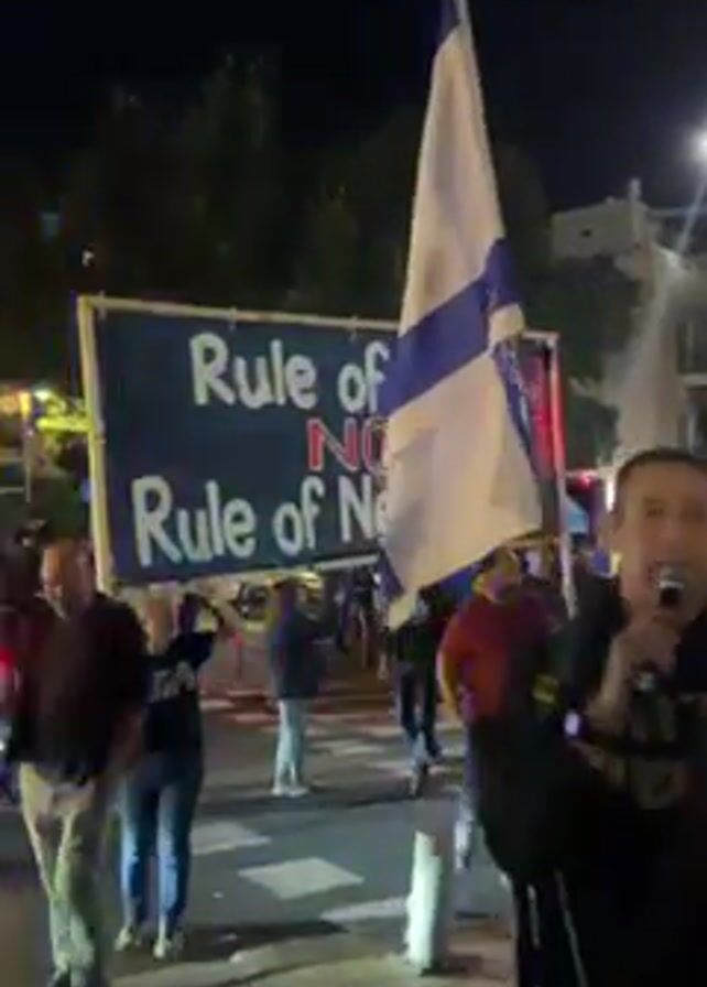 A nighttime political protest. Several people are holding signs saying "Rule of Law NOT Rule of Netanyahu", some people are holding Israeli flags, and one person is speaking into a microphone. The protesters appear to be marching down a street in a city.