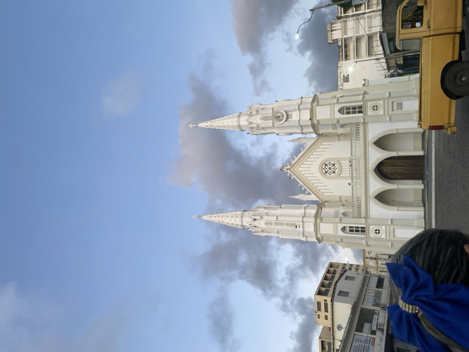 The image depicts the Iglesia Santa Rosa de Lima, a prominent white Neo-Gothic church located in Juan Griego, Venezuela. The church features two tall, slender spires; the left spire is topped with a cross and includes a distinct crescent moon and star symbol below it, while the right spire also culminates in a cross and contains a clock face. The central facade of the church presents multiple pointed arch entrances at ground level, a balcony above them, and a circular rose window in the upper section. The sky in the upper half of the frame is partly cloudy, displaying light blue areas interspersed with gray and white clouds. In the lower-left foreground, the back of a person's head is visible, characterized by dark hair and a prominent blue bow with a central golden or jeweled embellishment. On the lower-right, a yellow pickup truck is partially visible, appearing to be on a paved street. Surrounding the church are multi-story buildings; a light-colored commercial or residential structure is visible to the left, and another multi-level building is present to the right.