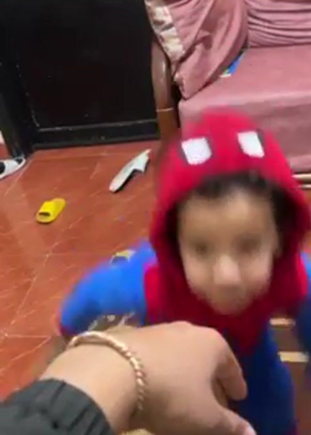 A young child in a Spider-Man costume stands on a brown rug in a room with red tile flooring. The child is facing the camera and holds a small stick. An adult hand wearing a gold bracelet reaches towards the child. The child then turns to face the adult, grabs their hand, and kisses it. The child is wearing a red and blue hooded Spider-Man costume. A dark door is visible in the background. Yellow sandals are on the floor near the rug. A sofa with burgundy cushions is in the background.