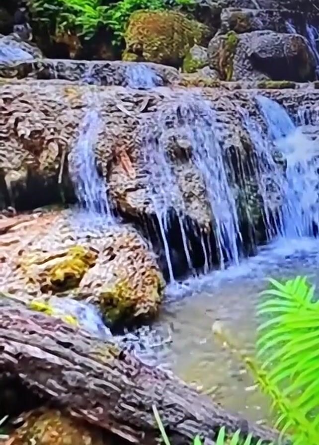 small waterfall cascading over rocks and greenery. The water is clear and flowing, and the surrounding environment is lush. There is a fallen log near the bottom of the frame. The video appears to be taken in a natural setting.