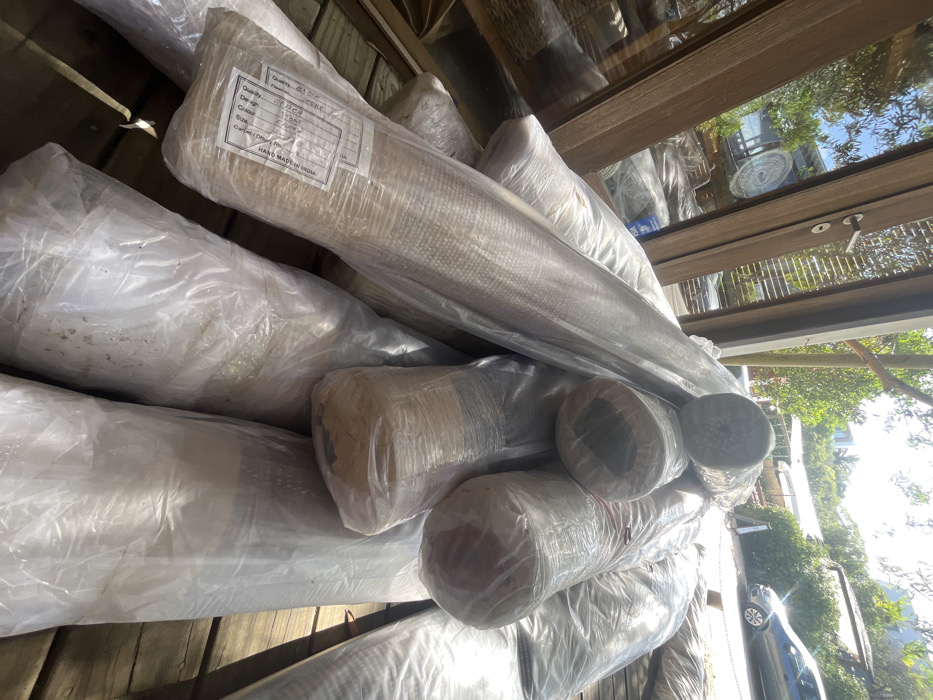 Several rolls of carpets are stacked on top of each other, wrapped in clear plastic