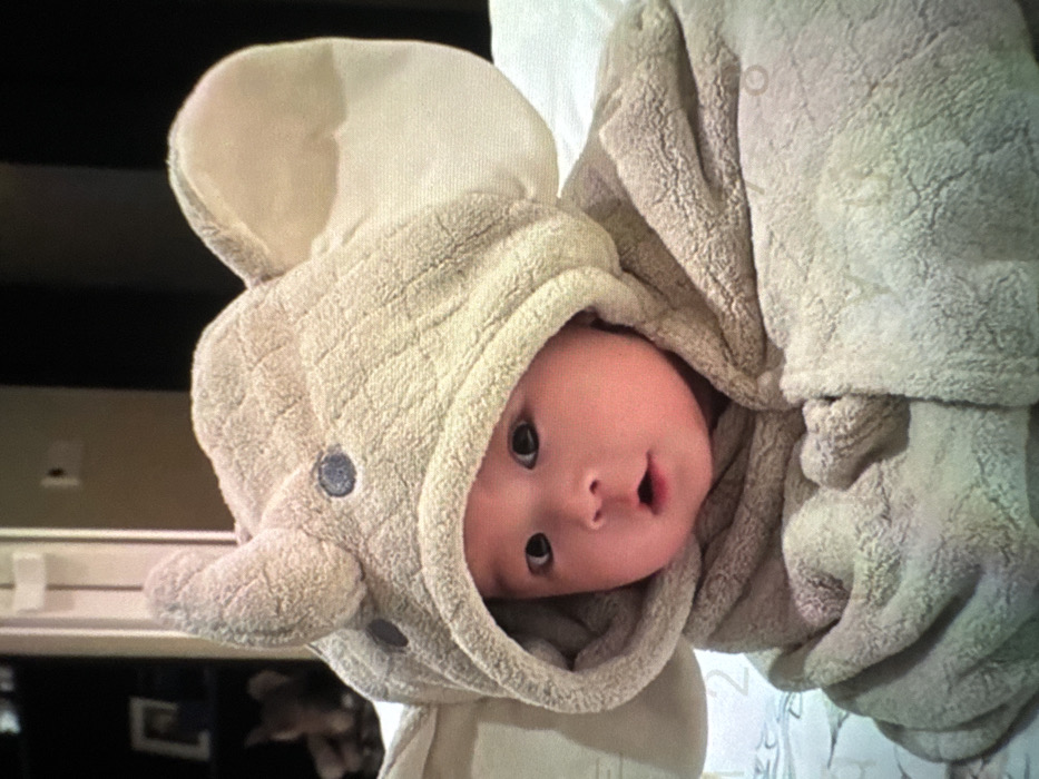 A baby, swaddled in a beige terrycloth robe with an elephant hood, looks directly at the camera