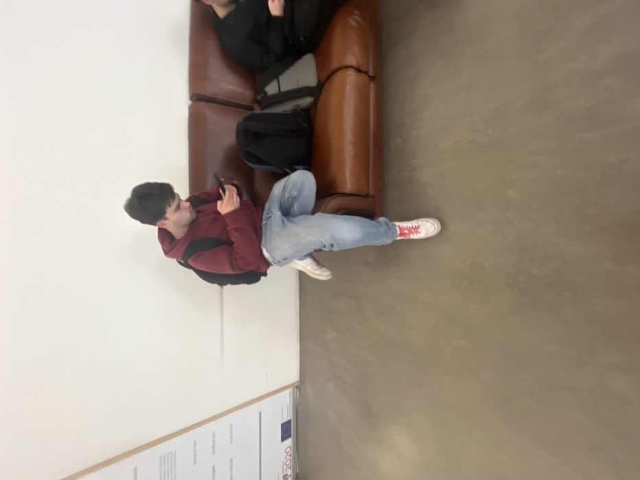 A young male is seated on a segmented brown leather sofa, positioned against a plain white wall. He is wearing a dark red hooded sweatshirt, light blue denim jeans, and white sneakers with red laces. A black backpack is worn on his back. He holds a black smartphone in both hands, his gaze directed at the screen. To his right, another black backpack rests on the sofa, next to a second individual, partially visible, wearing a dark long-sleeved shirt. To the far left, a large, angled display board featuring text and "2020 EU" branding is visible. The floor is a uniform light gray-brown. This setting suggests an indoor public or educational institution, consistent with a location in Vila Real, Portugal.
