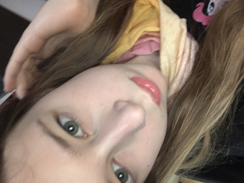 A young woman's face fills the frame. She has fair skin, green eyes, and light brown hair. Her lips are glossy. She wears a multi-colored fabric headband in shades of yellow, peach, and pink. A hand is partially visible near her hair. A black shirt with a pink pony design is present in the upper right corner. The image is slightly tilted.