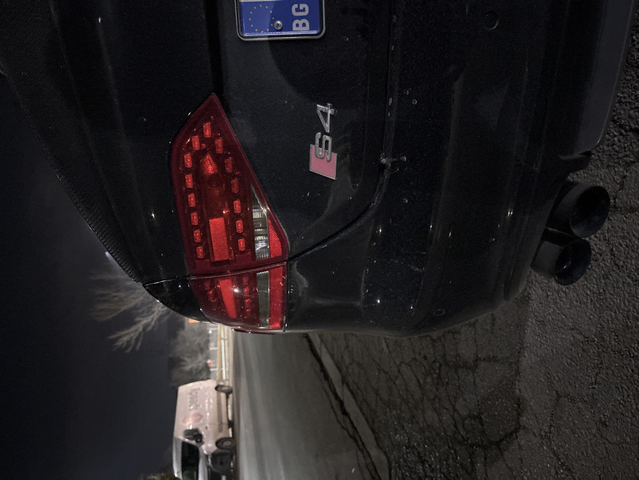 The image displays the rear driver's side of a black Audi S4 sedan parked at night in Unknown, Unknown
