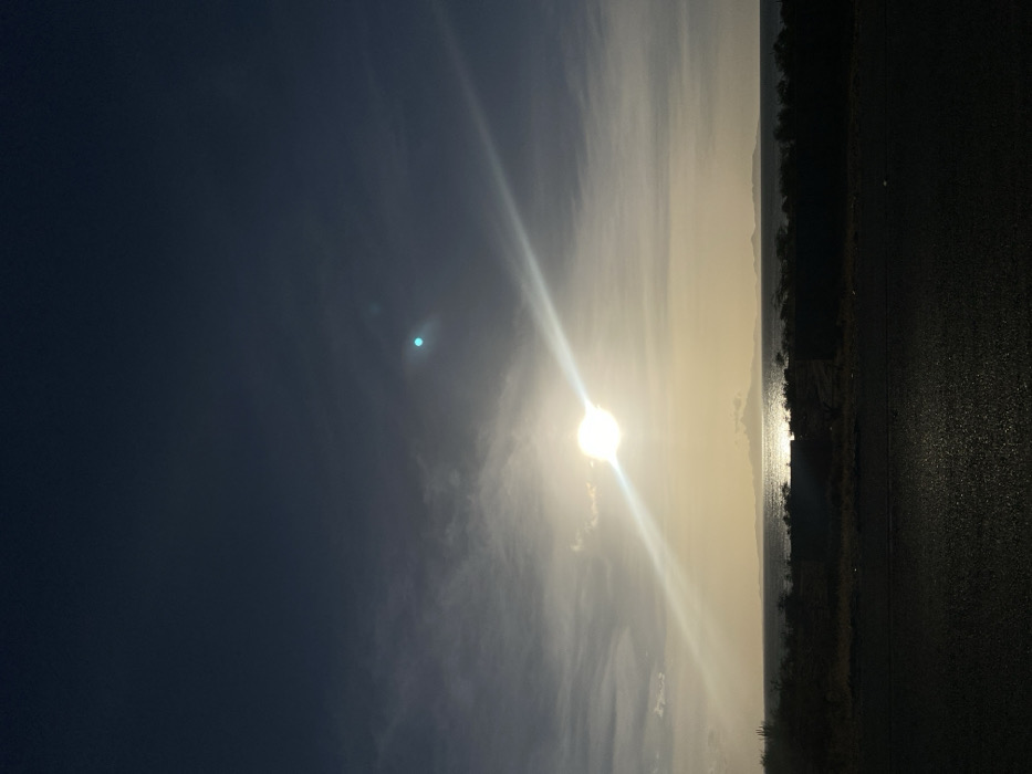 The image depicts a coastal scene in La Guardia, Venezuela, at either sunrise or sunset. The sun is prominently featured in the middle-left, partially obscured by clouds, emitting a strong diagonal lens flare across the frame. A distinct blue-green lens flare is also visible in the upper right sky. The sky transitions from a dark blue-grey at the top to lighter hues of grey and yellow near the horizon, with scattered cloud formations. Below the sun, a body of water, likely the ocean or a bay, reflects the bright sunlight. Along the distant horizon, multiple dark, mountainous landmasses are visible across the water. The midground consists of a dark, low-lying strip of sparse vegetation and several dark, rectangular structures, possibly walls or buildings. The immediate foreground shows a dark, paved surface, likely a road or asphalt, reflecting subtle light. No individuals, animals, or specific identifiable objects are present.