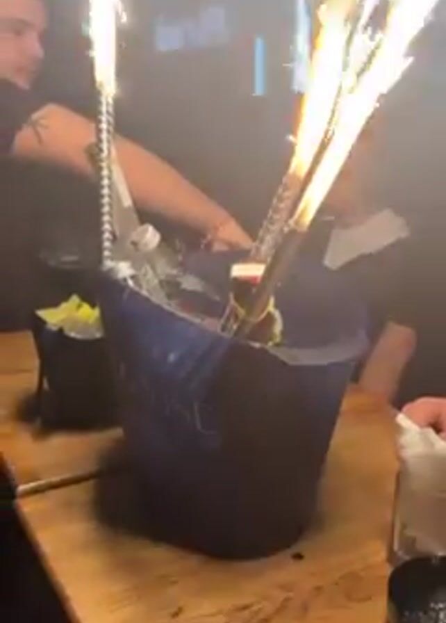 large blue ice bucket filled with bottles and lit sparklers on a wooden table, presumably in a club or bar environment