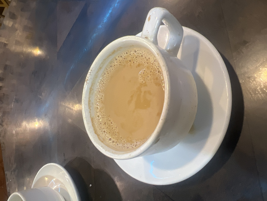 - "A white ceramic cup filled with a light brown, frothy beverage, consistent with chai, rests centrally on a white ceramic saucer" by FM-W2DEQ2, licensed under CC BY 4.0