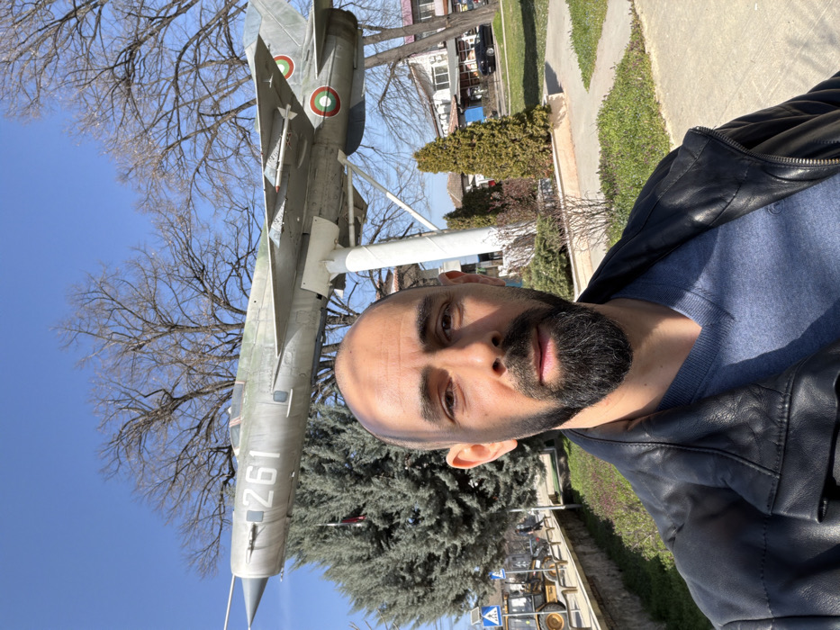 The image presents a male subject in a selfie format, foregrounded against an outdoor scene in Yoakim Gruevo, Bulgaria