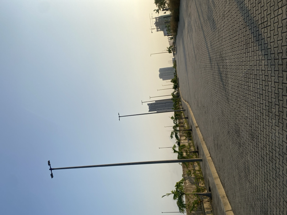 An outdoor scene shows a paved, herringbone-patterned road receding into the distance. Lamp posts line the left side of the road, interspersed with young palm trees. Tall buildings and construction cranes are visible on the horizon against a clear, light blue sky. The image is taken at an angle, making the road appear to converge strongly.