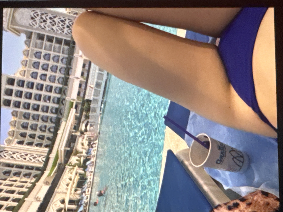 The scene is located in Cherven Bryag, Bulgaria. The image depicts a sun-drenched resort environment from a first-person perspective, focusing on the lower body of an individual reclining on a lounge chair. The subject's tanned legs are visible in the foreground, wearing a blue bikini bottom. A white paper cup with "GRAN..." branding (likely "Granada") and a purple stirrer rests on a light blue towel, which covers a blue-cushioned lounge chair. Partially visible on the far left is a leopard-print fabric item. In the midground, a large, sparkling blue swimming pool occupies most of the frame. Several individuals are present in the pool, with at least one person visible swimming in the upper left. The far edge of the pool is lined with numerous blue lounge chairs and umbrellas, suggesting a busy resort atmosphere. The background features a grand, multi-story building, likely a hotel or resort, characterized by its ornate architecture, numerous arched windows, and decorative elements. The building appears to be light-colored, possibly white or cream, and is situated amongst some visible greenery. The overall environment suggests a luxurious tourist destination.