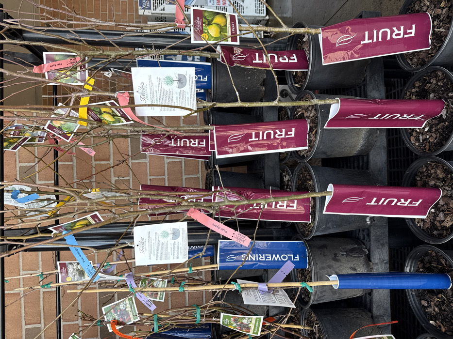 The image depicts an outdoor retail garden center display in Columbus, United States of America, likely a Lowe's Home Improvement store. Numerous bare-branched deciduous trees are arranged in black plastic nursery pots filled with soil and dark mulch. Many trees feature maroon plastic sleeves labeled "FRUIT" in white capital letters with a leaf icon, wrapped around their lower trunks. One tree displays a blue plastic sleeve labeled "FLOWERING." Small, colorful tags in pink, blue, yellow, purple, and orange are attached to branches, identifying specific varieties such as "Pear Ayers," "Pear Moonglow," and "Blackberry I." Several trees also have larger white informational tags from "Freedom Tree Farm," providing planting details. Some trees are supported by slender wooden stakes secured with green ties, and one tree's trunk is enclosed in a blue plastic tree guard. The potted trees are displayed on black gridded shelving units. A reddish-brown brick wall forms the background. To the far right, a white metal grate and partial text from a sign, including "CLEAN AND HOME," are visible on a lighter background, indicating a commercial building exterior. No individuals are present in the scene.