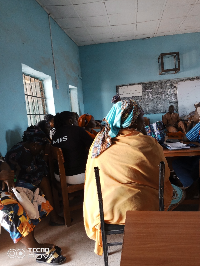 The image depicts an indoor scene in Kakuri Gwari, Nigeria, likely a classroom or meeting room, where approximately ten individuals are seated
