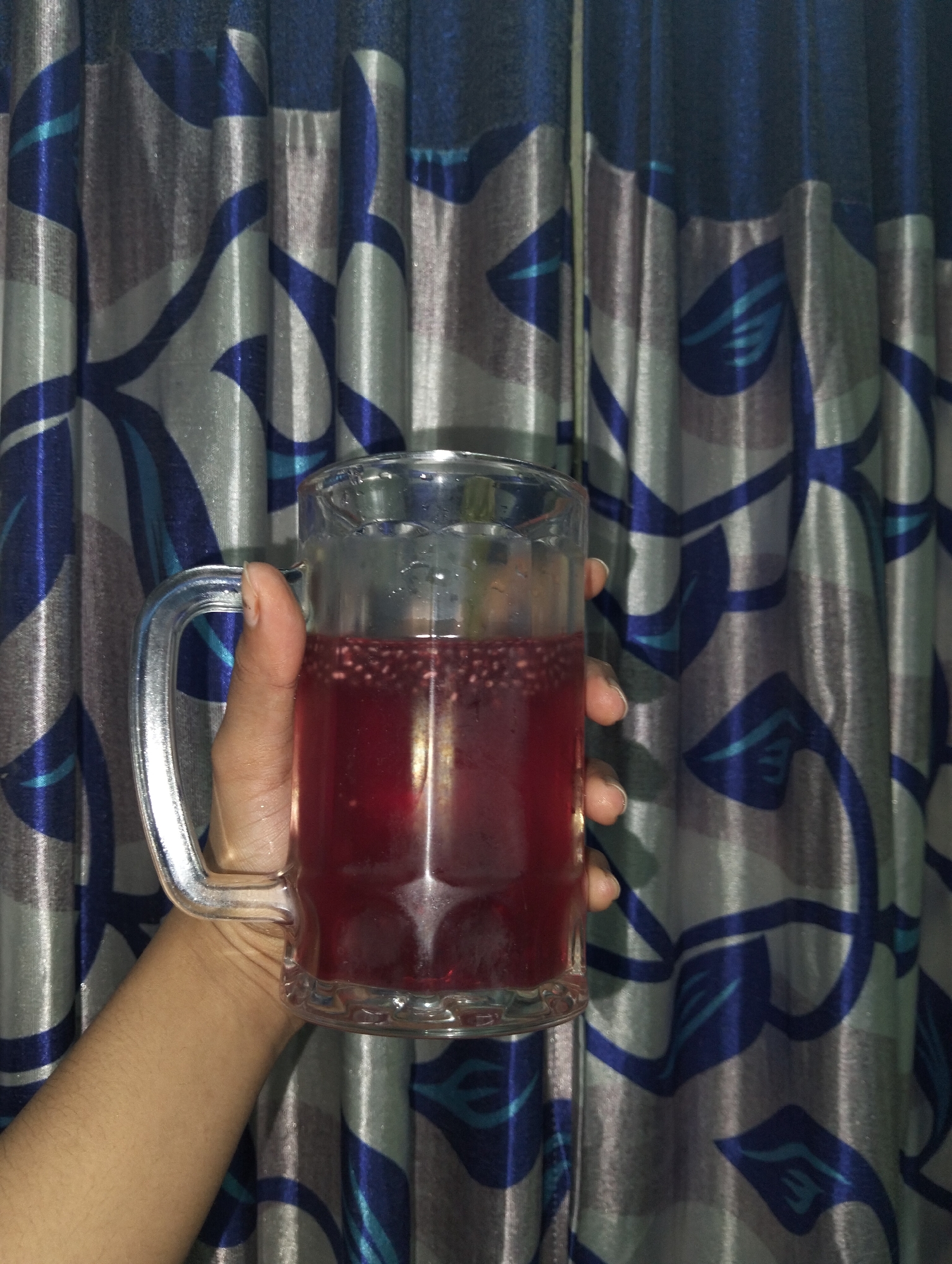 A person is holding a glass mug filled with a red liquid, possibly a beverage with small seeds or bits floating within. The hand holding the mug appears to be lightly tanned. The background features a curtain with a pattern of blue and gray swirling shapes, possibly floral or abstract in design. While a specific location in Dhaka, Bangladesh is not discernible from the image, the general details can still be provided.