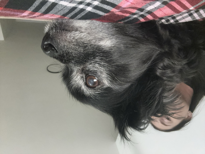 This close-up image depicts an indoor scene in Nesher, Israel. The primary subject is a medium-sized dog, predominantly black with significant graying around its muzzle, eyes, and ears, indicating age. Its right eye is clearly visible, appearing dark brown with a notable haziness. The dog is positioned with its head resting on a surface covered by a red, black, and white plaid fabric. In the upper-left background, a person with long, dark hair is partially visible and out of focus, positioned behind the dog's head, with only parts of their face discernible. The background consists of a plain, light-colored wall or ceiling.