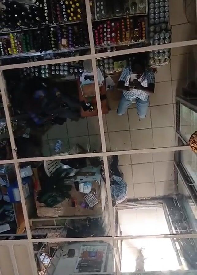 The video presents a top-down view of a store interior, reflected in a mirrored ceiling divided into a grid of squares. A person stands in the center of the frame, looking down at their mobile phone. A shelving unit filled with bottles and cans lines the top of the frame, with other store items scattered around the floor. Another person walks into the scene from the bottom right corner, passing by the person using their phone. The store appears to be brightly lit by natural light coming through a window.