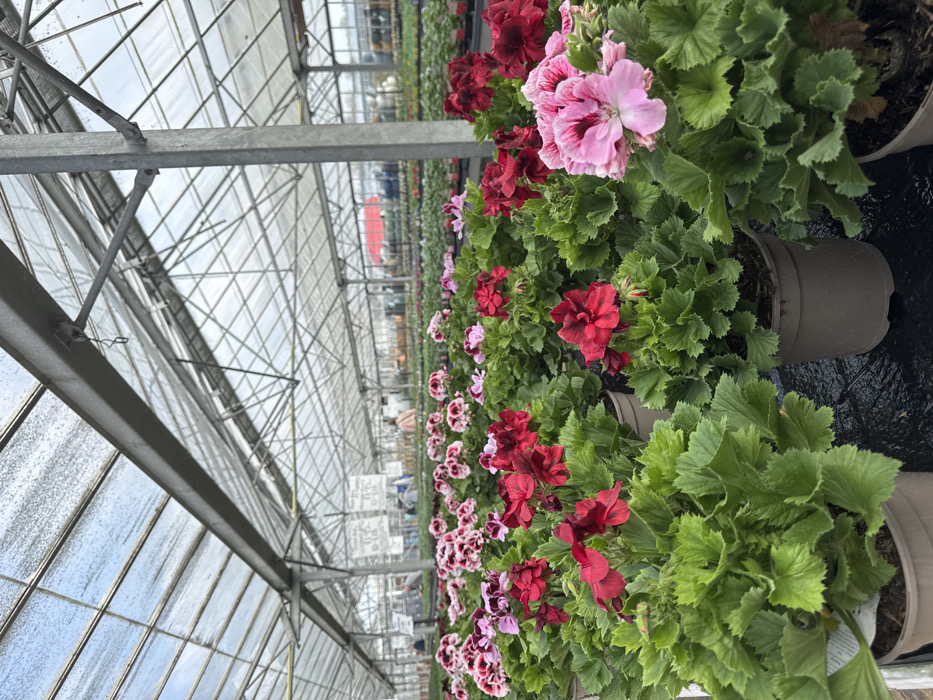 This image depicts the interior of a large commercial greenhouse or garden center, located in the Wyre Forest district of the United Kingdom. The foreground is dominated by numerous potted Pelargonium (geranium) plants, arranged in rows on a black ground cover. The flowers exhibit a variety of colors, including vibrant red, pale pink, deep burgundy, and variegated pink and white petals, all contained within uniform brown or grey plastic pots. The greenhouse structure features a transparent roof composed of glass or polycarbonate panels, supported by a framework of galvanized metal beams, trusses, and vertical posts. Moisture or condensation is visible on the interior surface of the roof panels. In the mid-ground and background, additional rows of potted plants extend into the distance. Several blurred human figures are discernible in the background, moving within the facility, suggesting customers browsing or staff working. White rectangular signs with black lettering, displaying pricing information (including the "£" symbol), hang from the overhead structure. A distant red structure, possibly a building or large canopy, is partially visible through the far end of the greenhouse. The overall environment is well-lit by natural light filtering through the transparent roof.