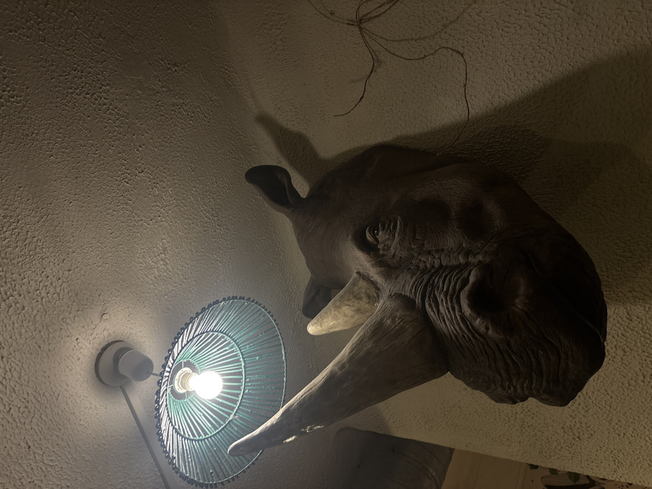 - "A wall lamp illuminates a rhino head mount" by FM-r52ok1, licensed under CC BY 4.0